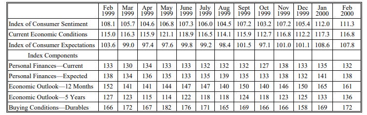 ”Consumer confidence showed no signs of any further deterioration in the last half of February. The most remarkable finding was that soaring gas prices, higher interest rates, and declines in stock market wealth had only a minor impact on confidence, with the Sentiment Index remaining at a higher level during the first two months of 2000 than at any other time during the past 50 years.”17