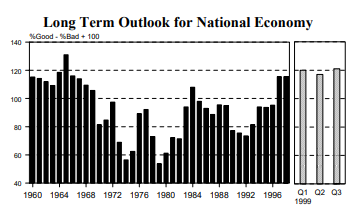 Consumers judged long term economic prospects more favorably throughout 1999 than at any time since the mid 1960's. Perhaps even more remarkable is that consumers have increasingly adopted optimistic expectations as the current expansion has lengthened.11