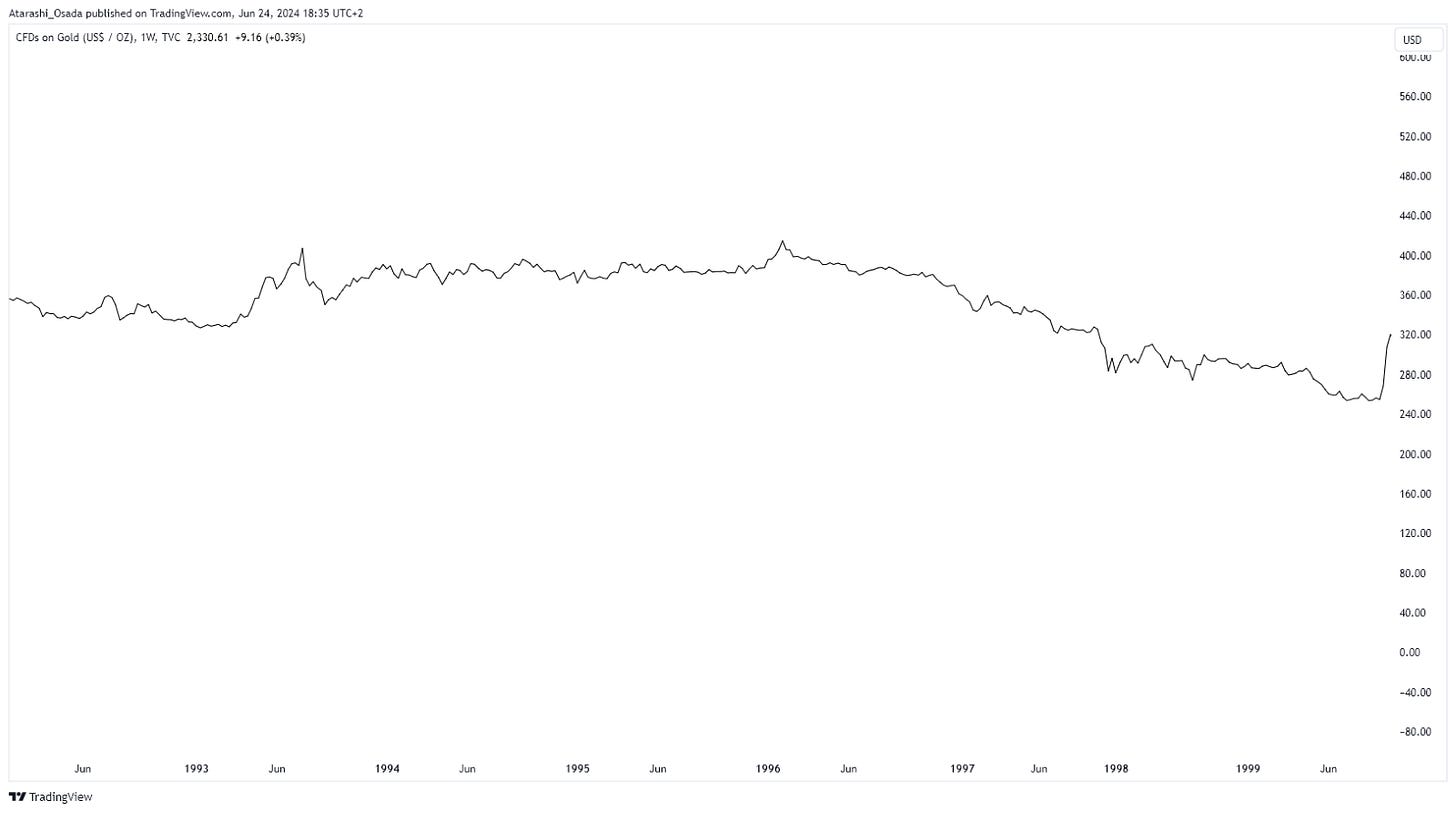 ➡️ Gold saw a jump due to the Central Bank Gold Agreement, which aimed at slowing the downfall of the gold price by capping gold selling by central banks, among other measures.8